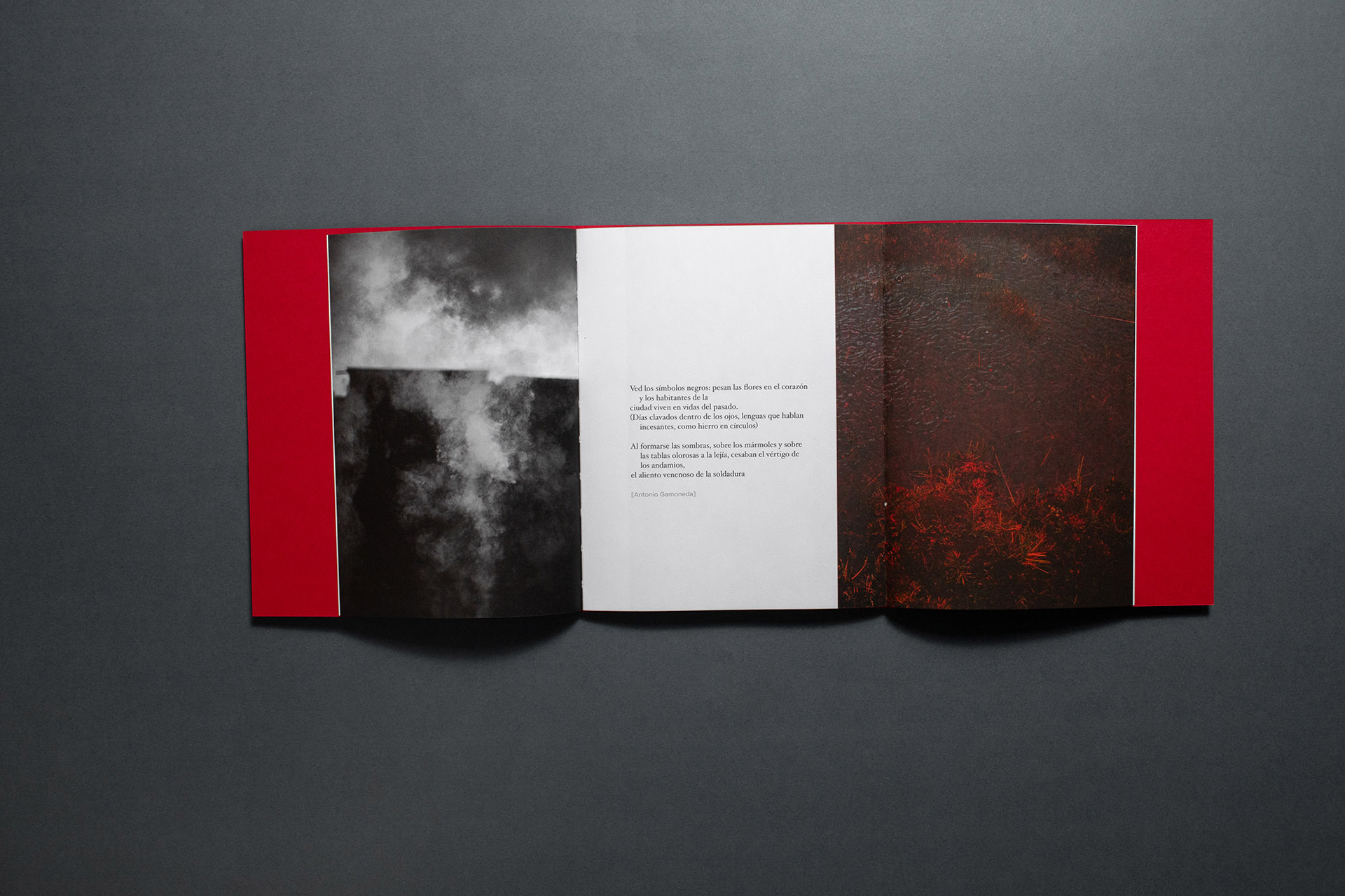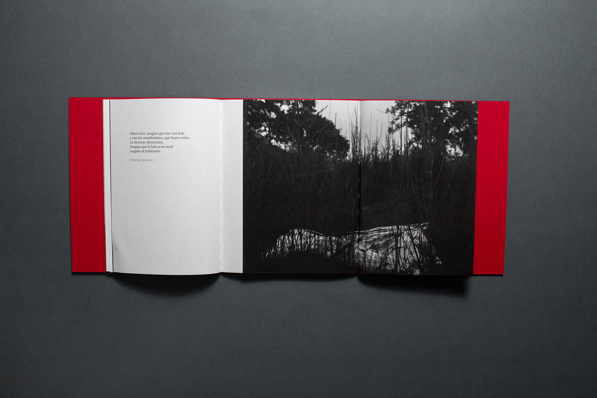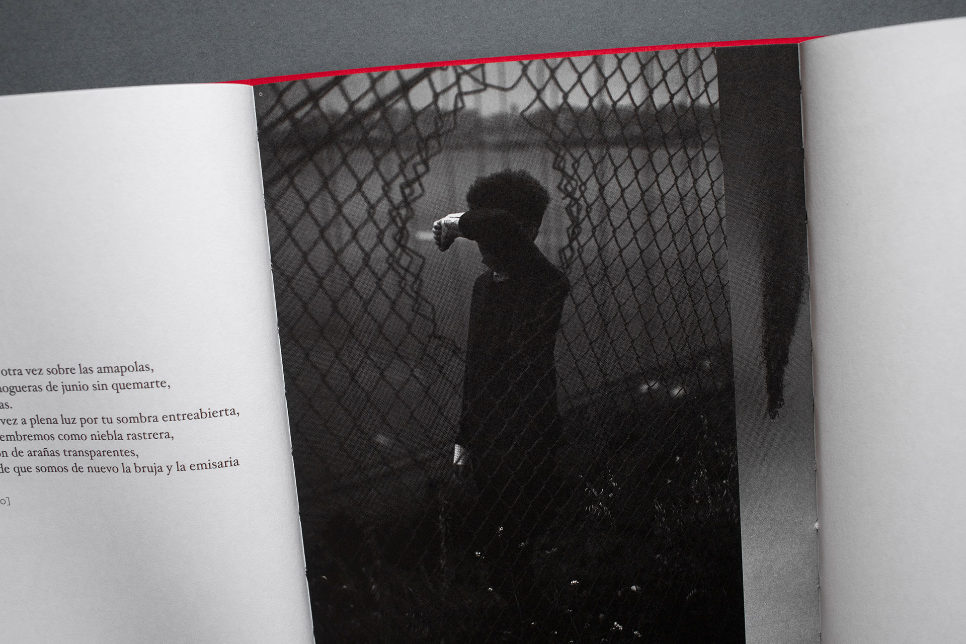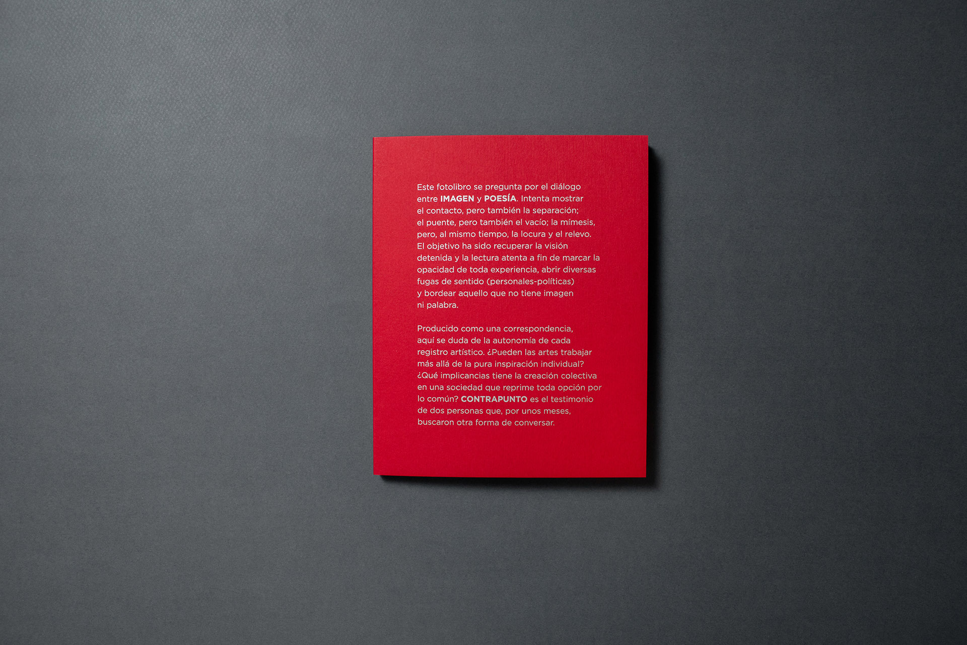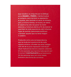 Este fotolibro se pregunta por el diálogo entre IMAGEN y POESÍA. Intenta mostrar el contacto, pero también la separación; el puente, pero también el vacío; la mímesis, pero, al mismo tiempo, la locura y el relevo. El objetivo ha sido recuperar la visión detenida y la lectura atenta a fin de marcar la opacidad de toda experiencia, abrir diversas fugas de sentido (personales - políticas) y bordear aquello que no tiene imagen ni palabra.