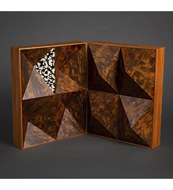 Para su colaboración con Meier Ramírez, Gabriel Acevedo Velarde ha producido un libro de madera que replica a escala la forma de difusores de sonido presentes en salas de conciertos, teatros o estudios de sonido.