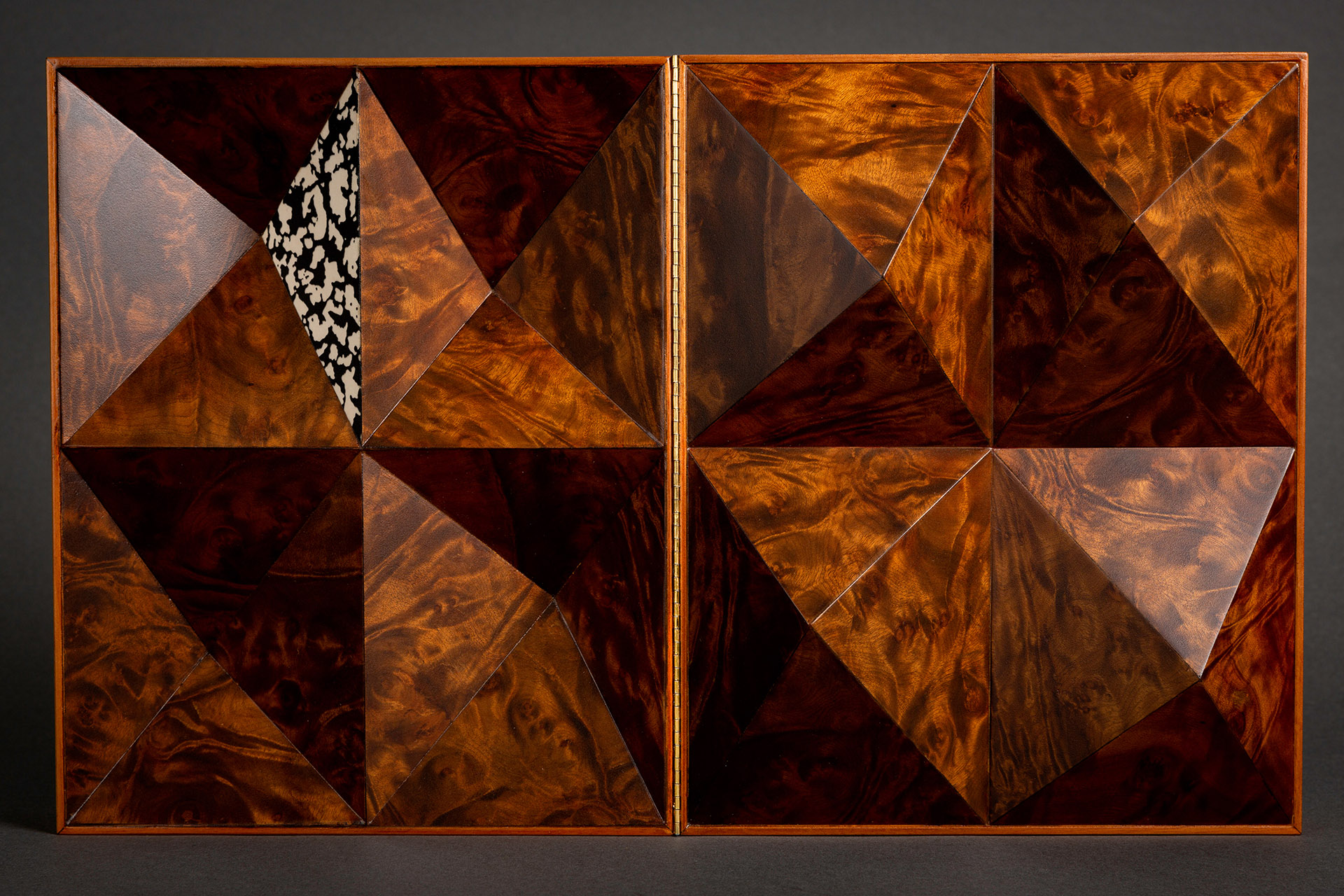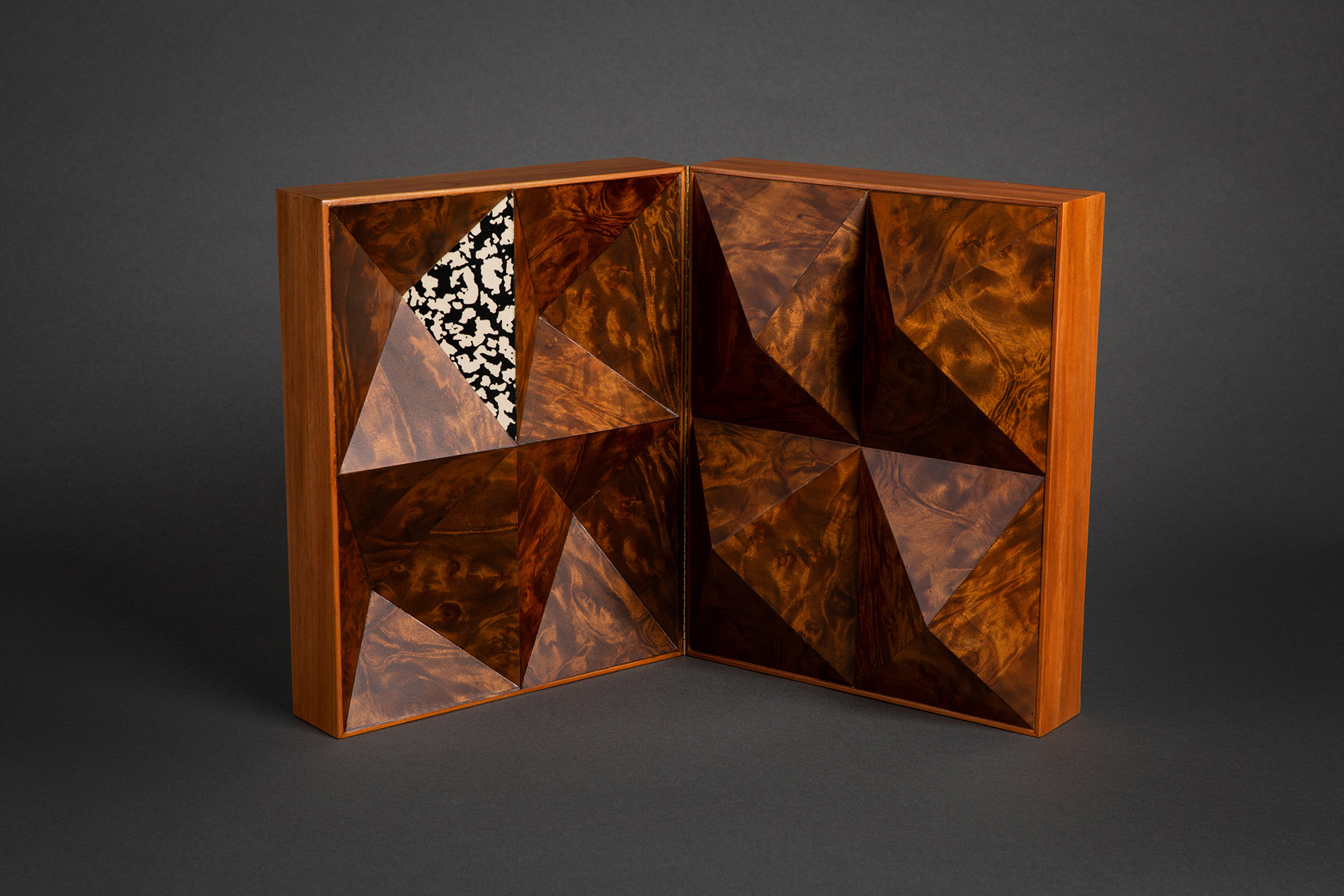 Láminas de raíz de laurel, serigrafía con patrón “Spugnatto” de Etore Sottsass, madera de cachimbo, MDF, bisagra de metal