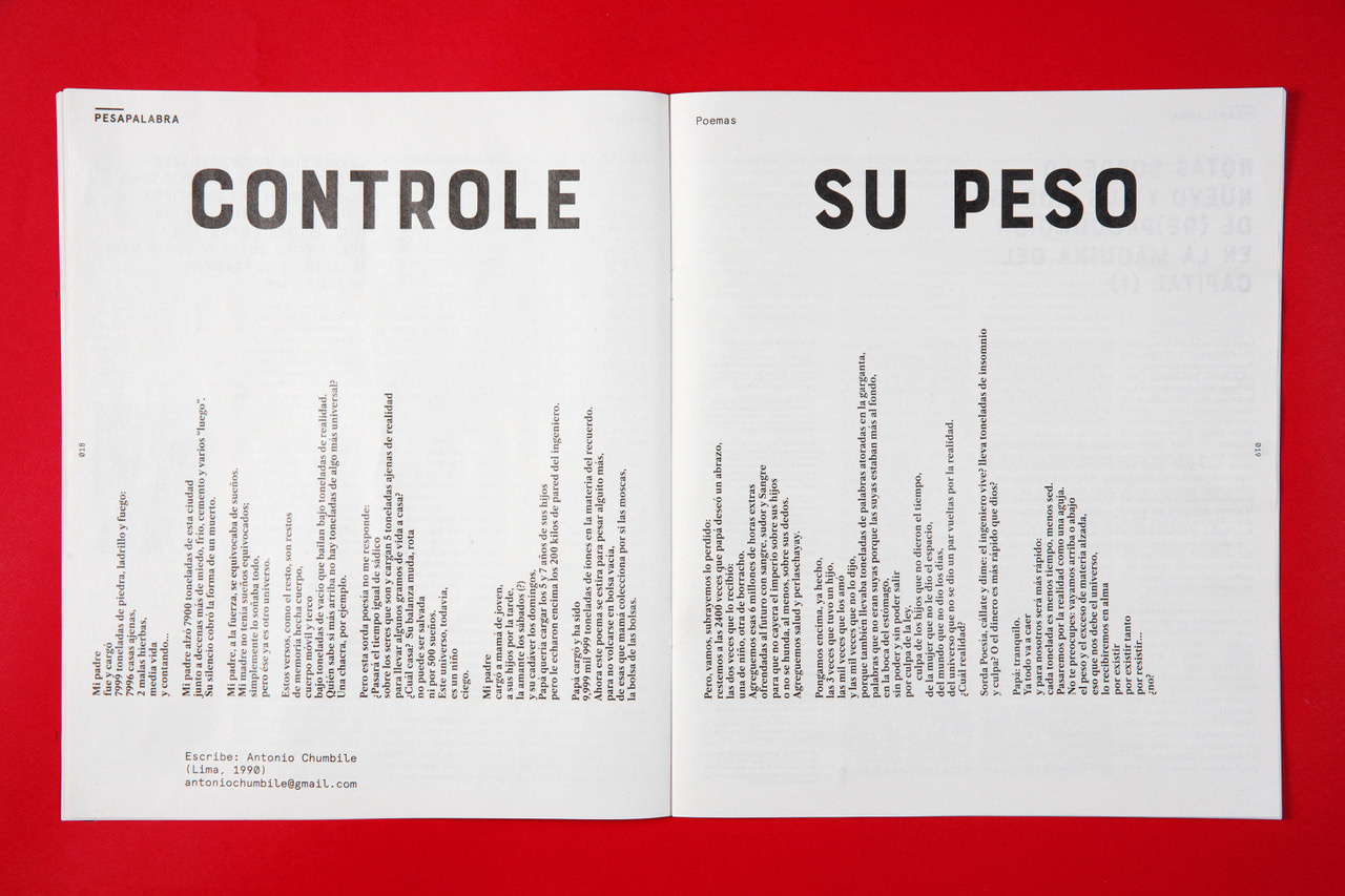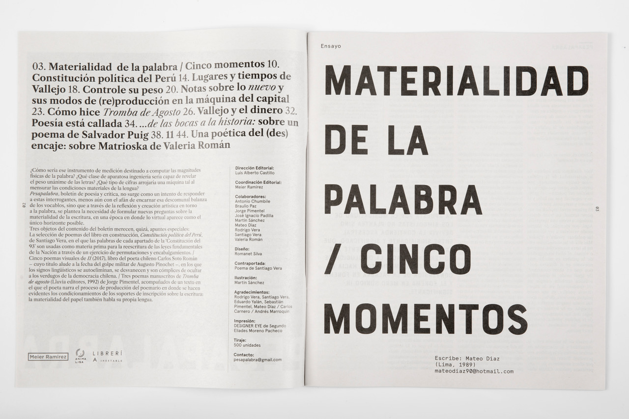 La selección de poemas del libro en construcción, Constitución política del Perú, de Santiago Vera, en el que las palabras de cada apartado de la ‘Constitución del 93’ son usadas como materia prima para la reescritura de las leyes fundamentales de la Nación a través de un ejercicio de permutaciones y encabalgamientos. / Cinco poemas visuales de 11 (2017), libro del poeta chileno Carlos Soto Román – cuyo título alude a la fecha del golpe militar de Augusto Pinochet –, en los que los signos lingüísticos se autoeliminan, se desvanecen y son cómplices de ocultar a los verdugos de la democracia chilena. / Tres poemas manuscritos de Tromba de agosto (Lluvia editores, 1992) de Jorge Pimentel, acompañados de un texto en el que el poeta narra el proceso de producción del poemario en donde se hacen evidentes los condicionamientos de los soportes de inscripción sobre la escritura: la materialidad del papel también habla su propia lengua.