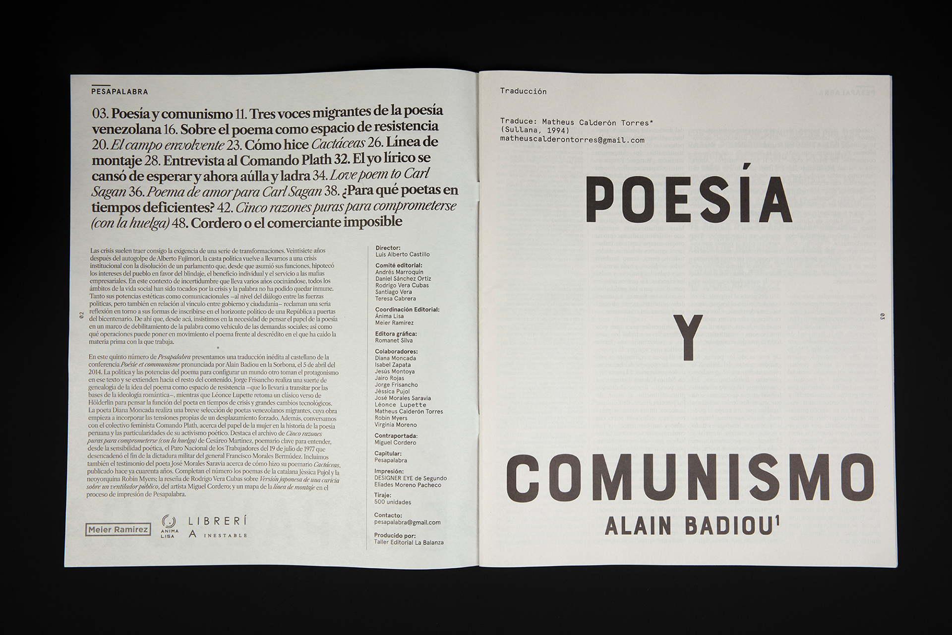 En este quinto número de Pesapalabra presentamos una traducción inédita al castellano de la conferencia Poésie et communisme pronunciada por Alain Badiou en la Sorbona, el 5 de abril del 2014. La política y las potencias