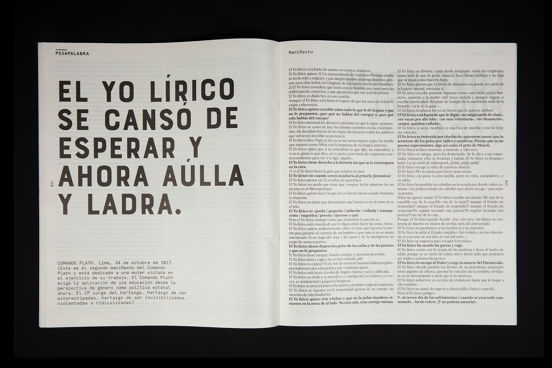Comando Plath, acerca del papel de la mujer en la historia de la poesía peruana y las particularidades de su activismo poético. Destaca el archivo de Cinco razones puras para comprometerse (con la huelga) de Cesáreo
