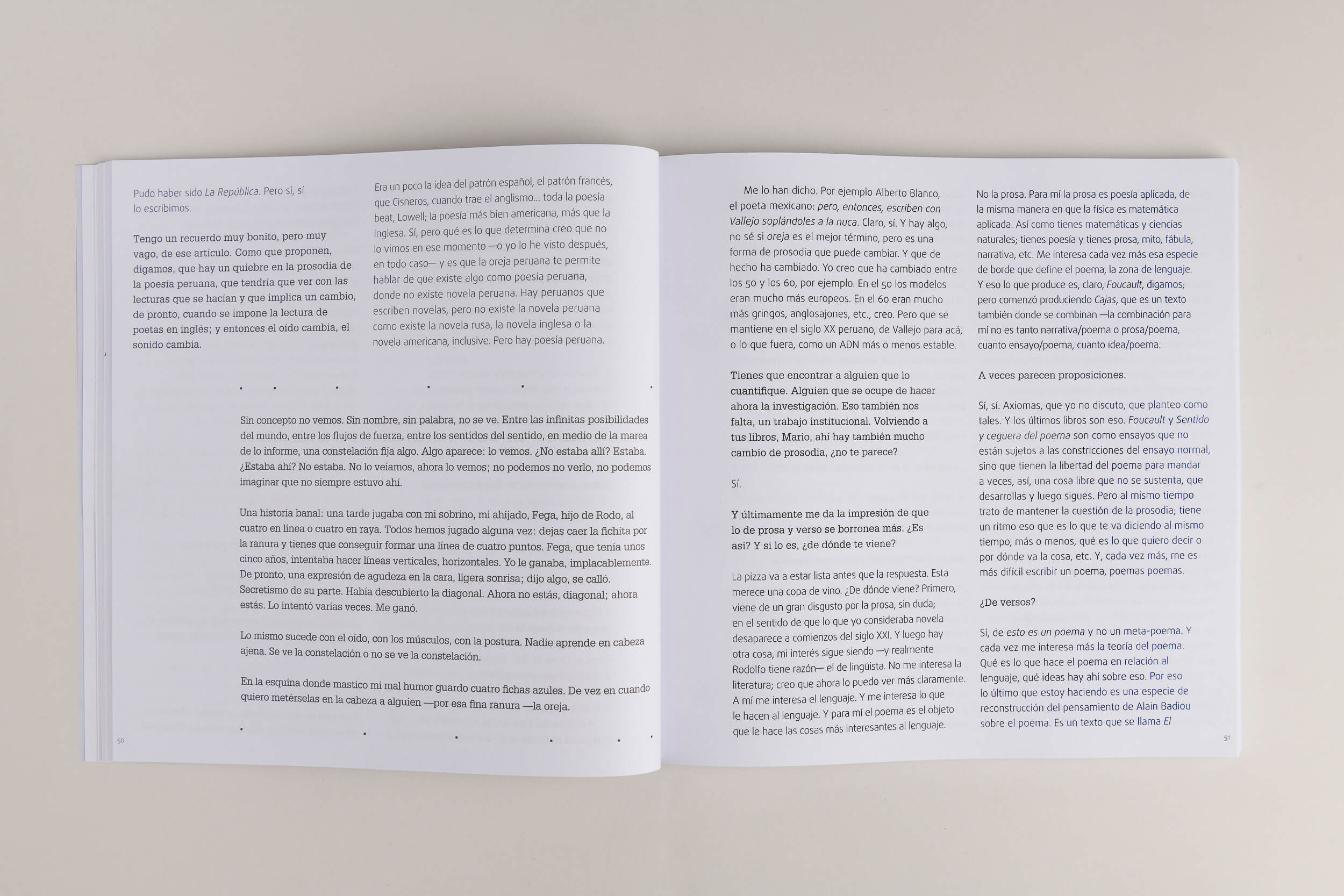coloquial; el razonamiento y la amistad: abordan cuestiones de tradición poética, teoría del lenguaje, historia cultural, crítica literaria, políticas de las identidades, globalización, mercado editorial, el afecto en la lengua