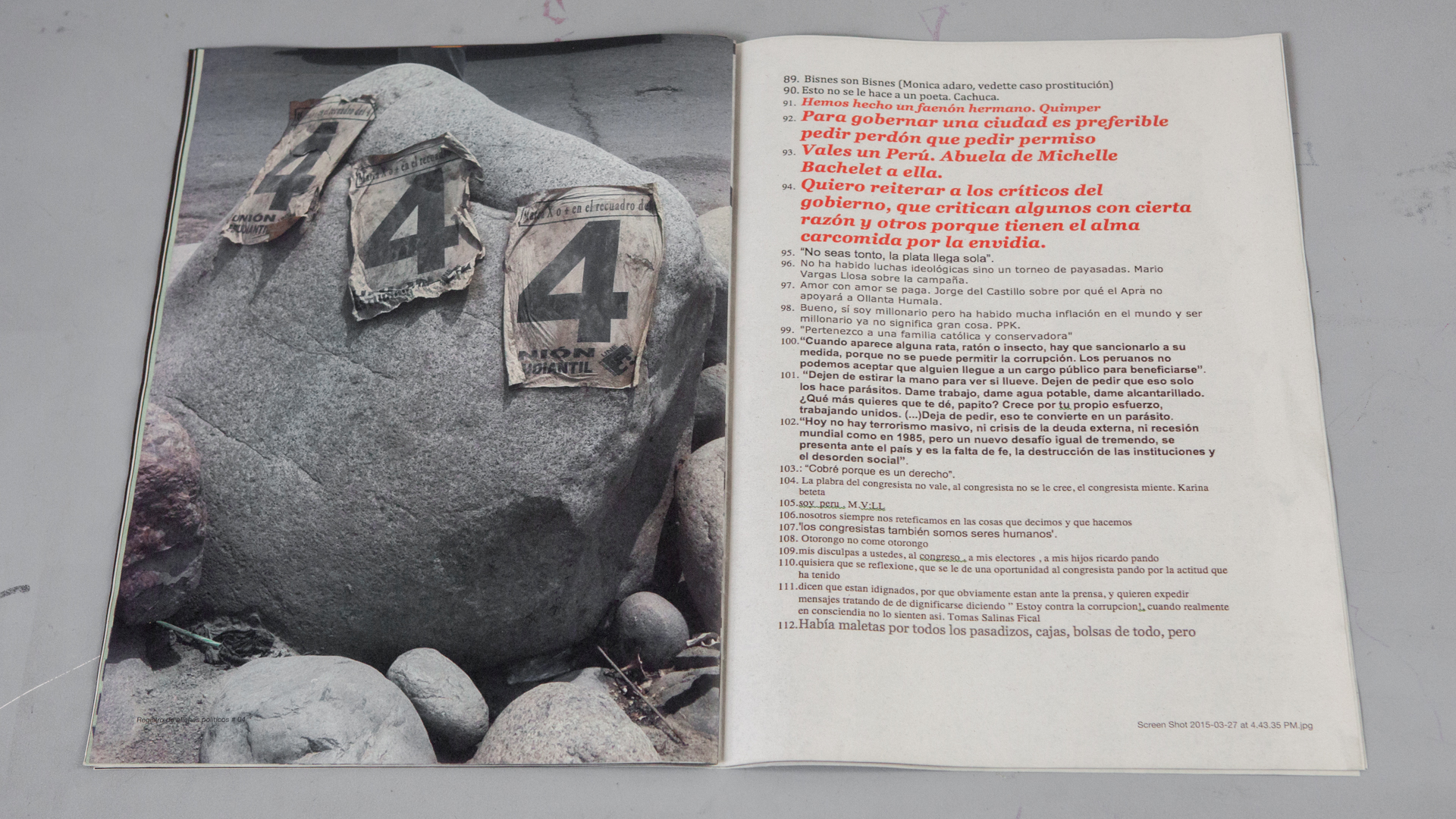 La publicación amalgama una serie de imágenes y screenshots que presentan una visión personal de la historia reciente del país compuesta por fotografías, pequeñas declaraciones, versos, frases, graffitis que trascienden su