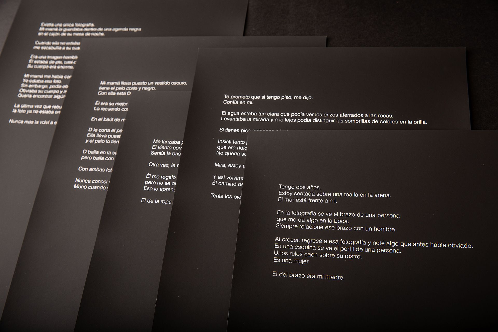 Empleando el medio fotográfico en su forma más clásica, los fotogramas de esta serie narran verbalmente momentos recordados a partir de un intercambio con la fotografía. Los textos producidos y tratados como imágenes aluden a una serie de situaciones que no se encuentran registradas físicamente en ellas mismas y se vuelven un vehículo para poner en evidencia la potencia y a la vez la precariedad de la fotografía en su relación con la evocación de recuerdos.